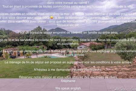 la villa est entourée de maquis (parfum délicieux au coucher du soleil avec un très jolie jardin pour profiter du calme et de la vue panoramique des montagnes .